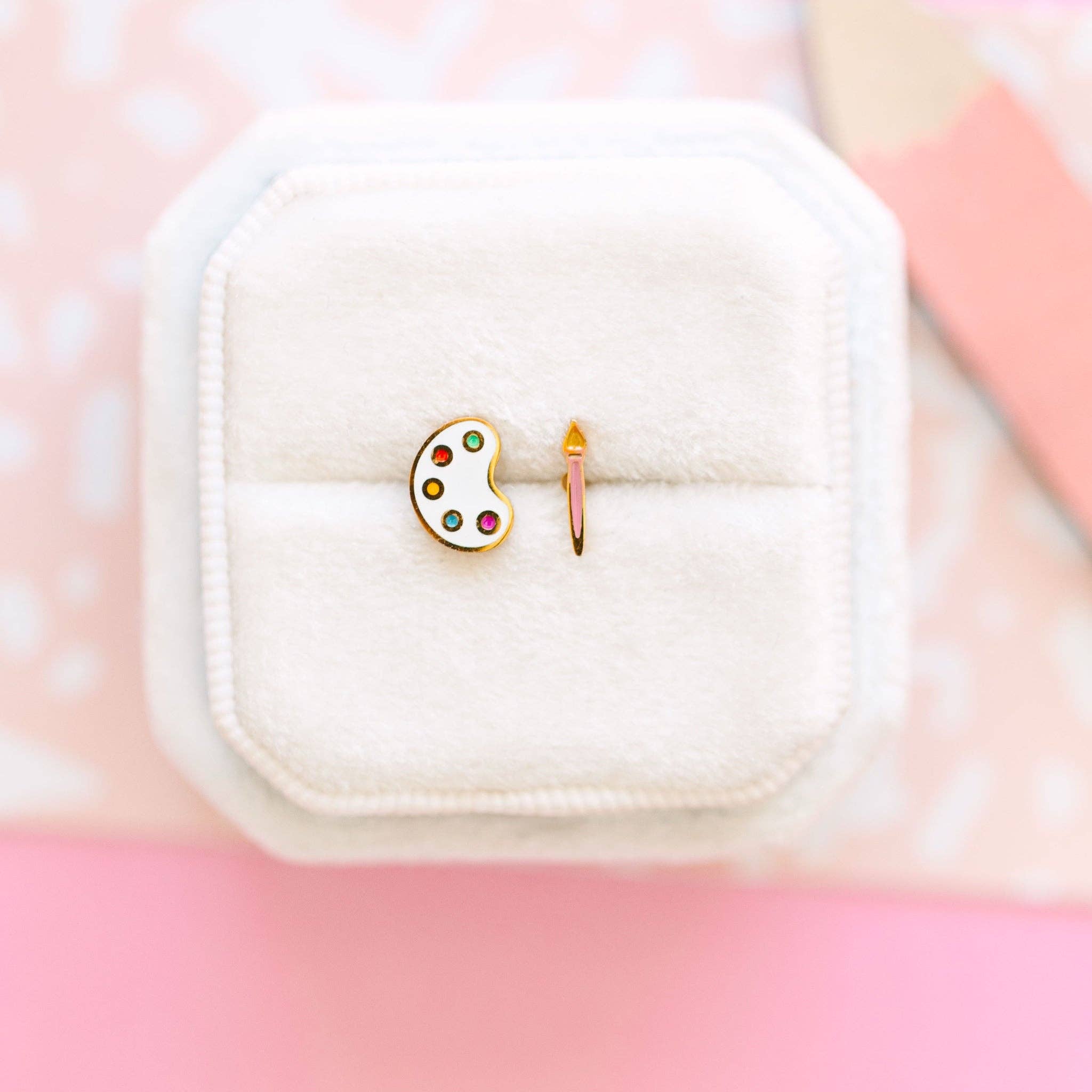 Your new go-to studs. Designed for girls with sensitive ears, these Paint Pallet & Brush earrings are made from surgical grade stainless steel with an 18K gold plated finish and enamel details. They’re always hypoallergenic, lead- and nickel-free, and completely waterproof—safe for the pool or bath.