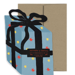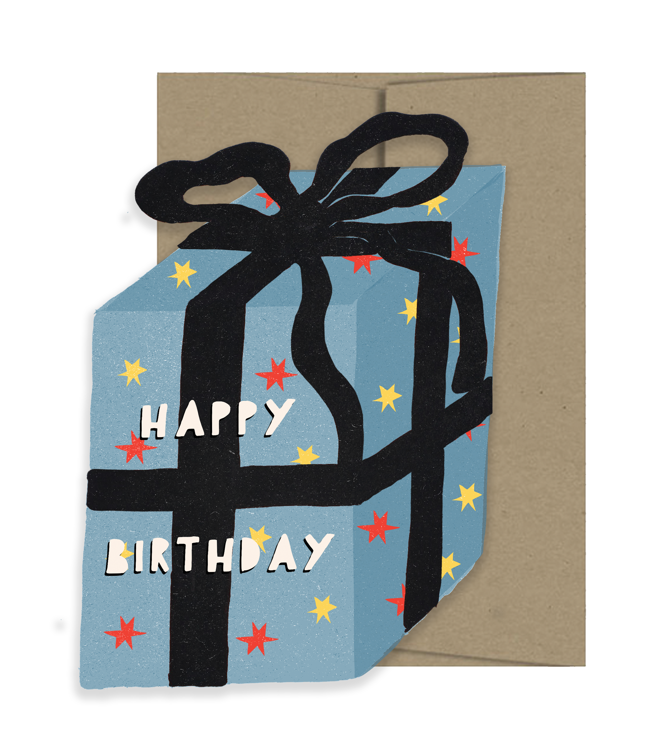 A charming birthday card featuring a beautifully wrapped gift topped with a bow—perfect for celebrating someone special. This die-cut folded card is blank inside, printed in the USA on sustainably sourced cardstock, and includes a kraft envelope.