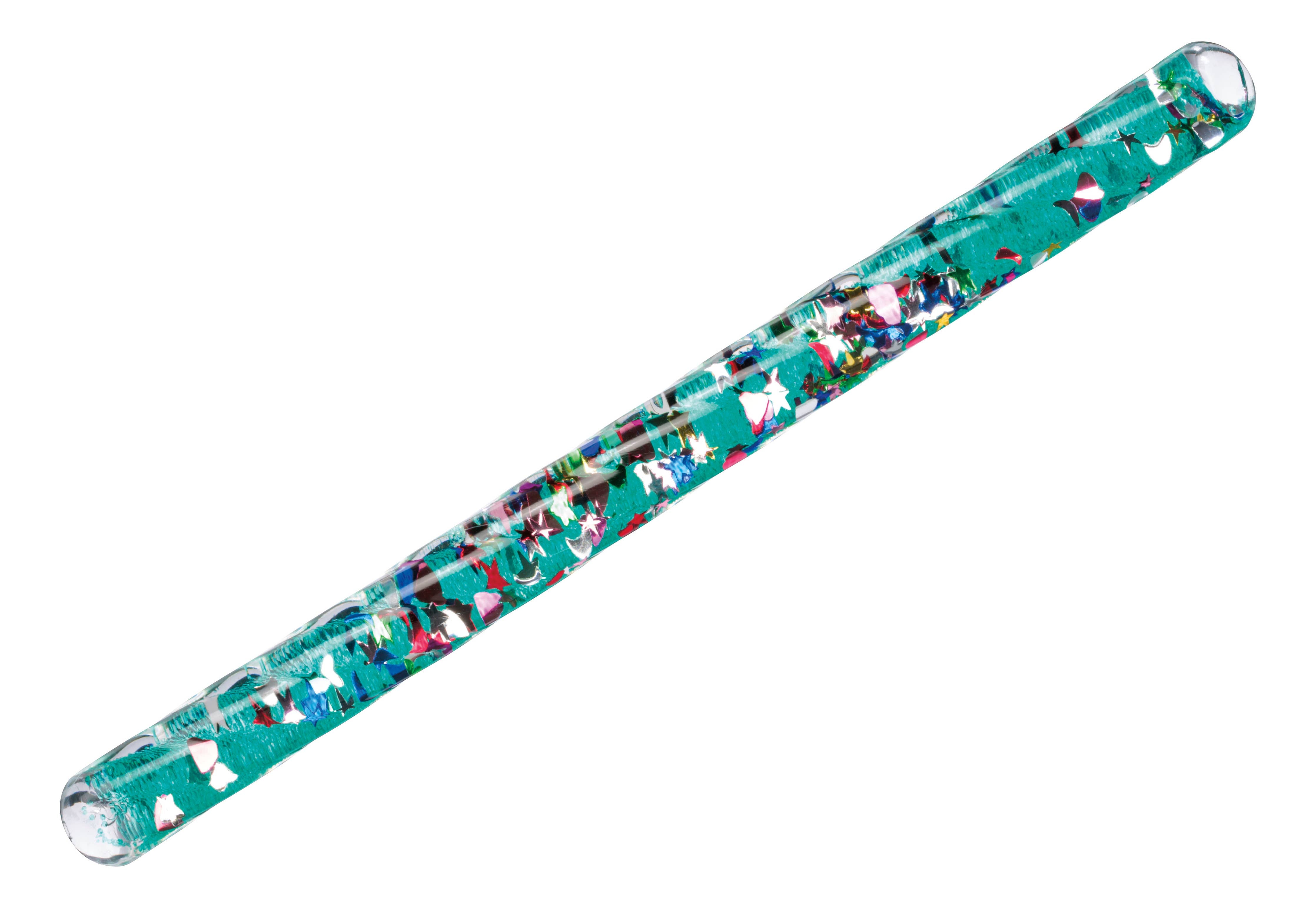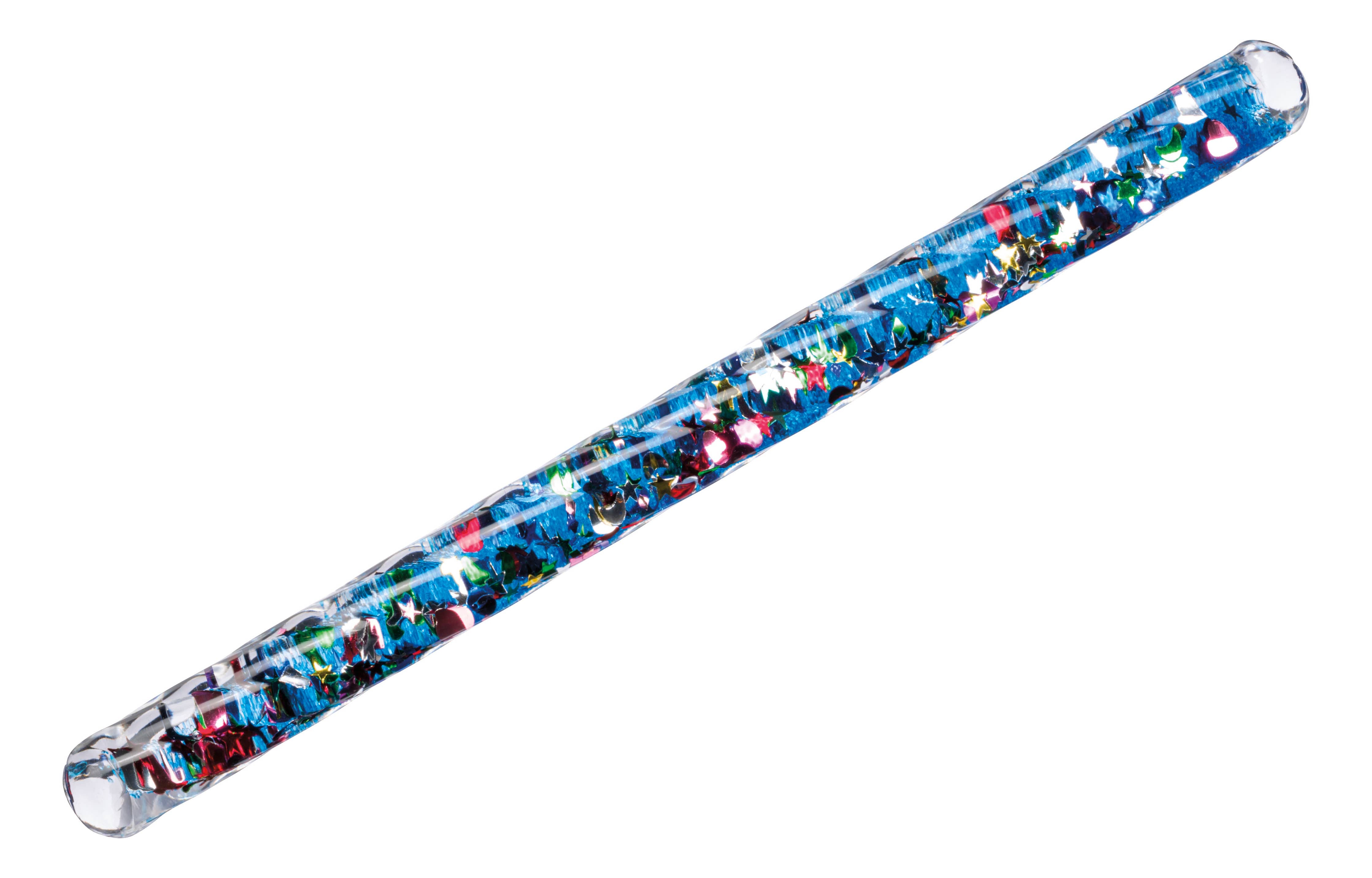 The Mystical Spiral Glitter Wand is easy for small hands to hold and mesmerize. Measuring 6.25 inches long, each wand features a variety of liquid color combinations filled with floating rainbow glitter specks and shapes. The unique interior spiral design ensures that the colors and glitter continuously swirl around each other when moved.  Age 4+
