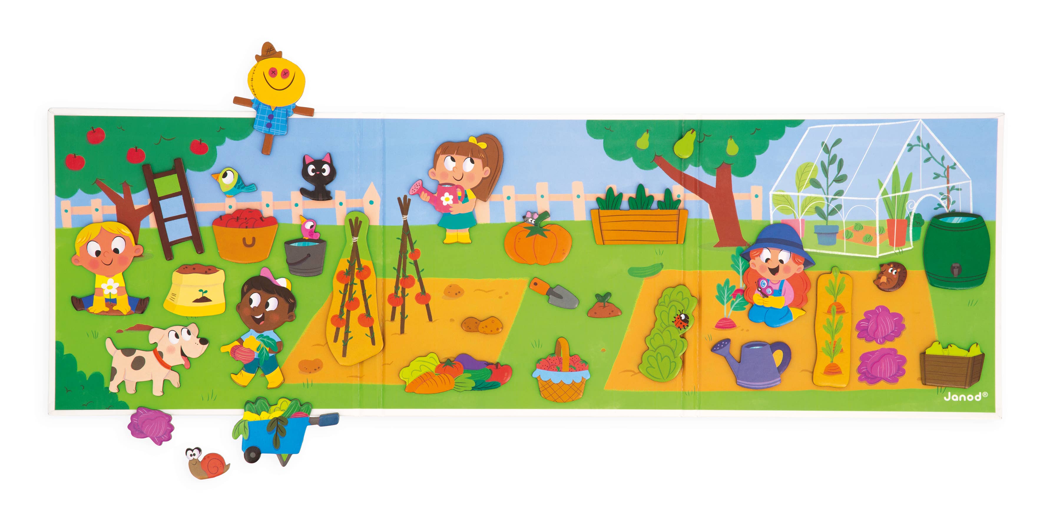 Spend a fun afternoon in the vegetable garden with this charming magnetic play set. Children can imagine watering plants, picking ripe fruit, and planting new vegetables while Mimi the little mouse watches from her hiding place. This set includes 30 magnets featuring fruit, vegetables, animals, and garden tools. Its compact mini format makes it perfect for creative play at home or on the go.